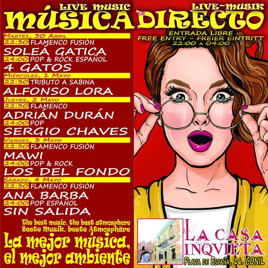 Live music. Free entrance.Live live music with the concerts of LA CASA INQUIETA, a place for drinks and music! LA CASA INQUIETA s, a bet for diverse music. In the heart of Conil, in the Plaza de España, 16. For more information about our events: https://www.facebook.com/lacasainquieta/