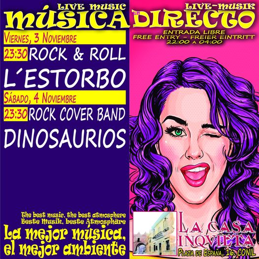 Live music. Free entrance.Live live music with the concerts of LA CASA INQUIETA, a place for drinks and music! LA CASA INQUIETA s, a bet for diverse music. In the heart of Conil, in the Plaza de España, 16. For more information about our events: https://www.facebook.com/lacasainquieta/