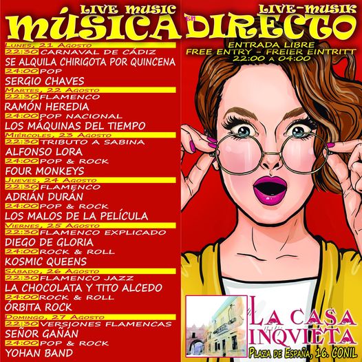 Live music. Free entrance.Live live music with the concerts of LA CASA INQUIETA, a place for drinks and music! LA CASA INQUIETA s, a bet for diverse music. In the heart of Conil, in the Plaza de España, 16. For more information about our events: https://www.facebook.com/lacasainquieta/