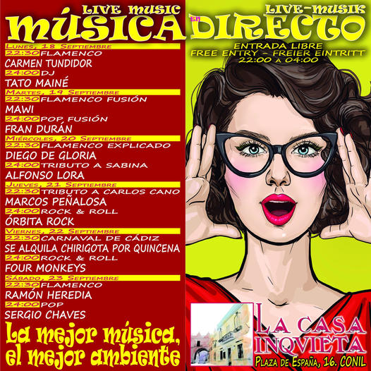 Live music. Free entrance.Live live music with the concerts of LA CASA INQUIETA, a place for drinks and music! LA CASA INQUIETA s, a bet for diverse music. In the heart of Conil, in the Plaza de España, 16. For more information about our events: https://www.facebook.com/lacasainquieta/