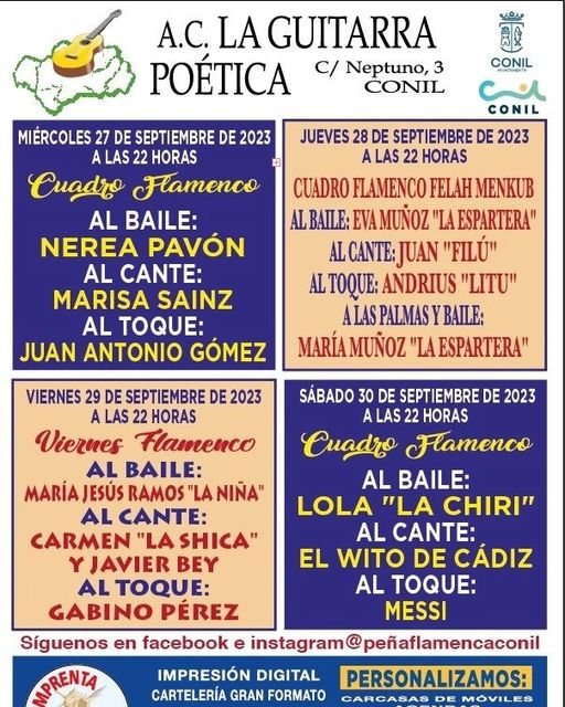 VIERNES FLAMENCO. Al baile María Jesús Ramos ‘La Niña’, al cante Carmen ‘La Shica’ y Javier Bey y al toque Gabino Pérez. INFORMACIÓNPuro flamenco. FechaVie, 29 Sep¡Caducado! Hora 22:00 LocalizaciónPeña FlamencaC/ Neptuno, 3 Organizador A.C. La guitarra poética Web https://www.facebook.com/guitarrapoetica.conil